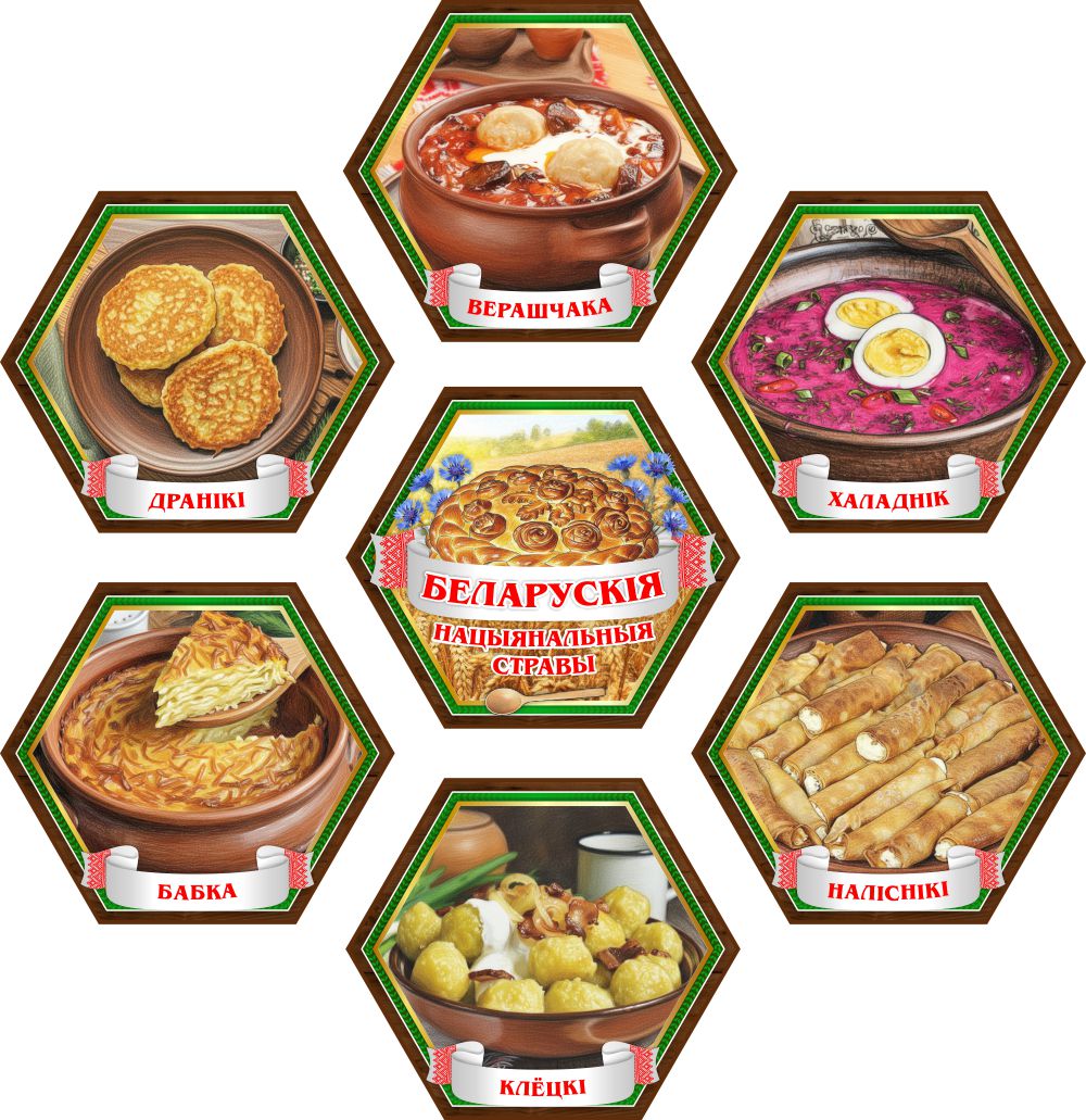 Гексы Беларускія нацыянальныя стравы Фигурный яркий стенд состоящий из 7 гексов, посвященный белорусским национальнным блюдам..