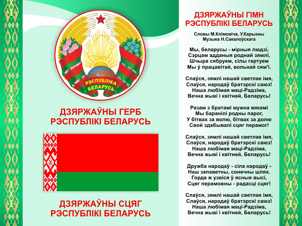 Гарантия качества Стенд с символикой (герб, гиимн, флаг Республики Беларусь) в зеленых тонах
