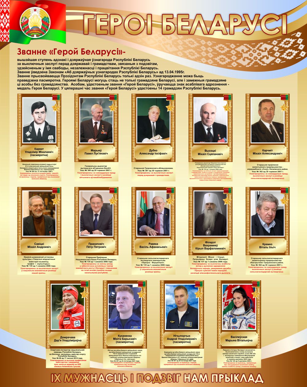 Гарантия качества Стенд "Героі Беларусі". Выполнен в золотисто-коричневых тонах. на белорусском языке
