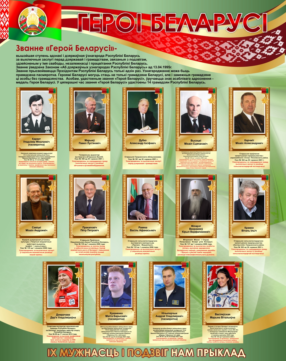 Модель 25659 Стенд Героі Беларусі в золотисто-зеленых с красным тонах 950*1200 мм