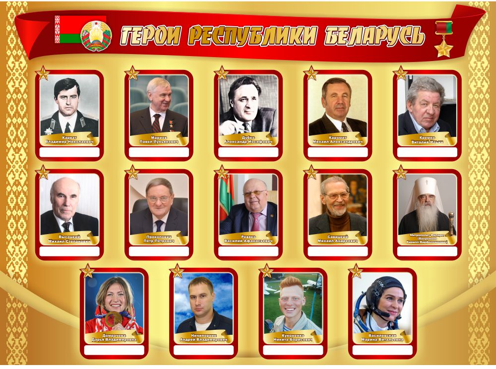 Гарантия качества Стенд "Герои Беларуси". Выполнен в золотистых тонах.