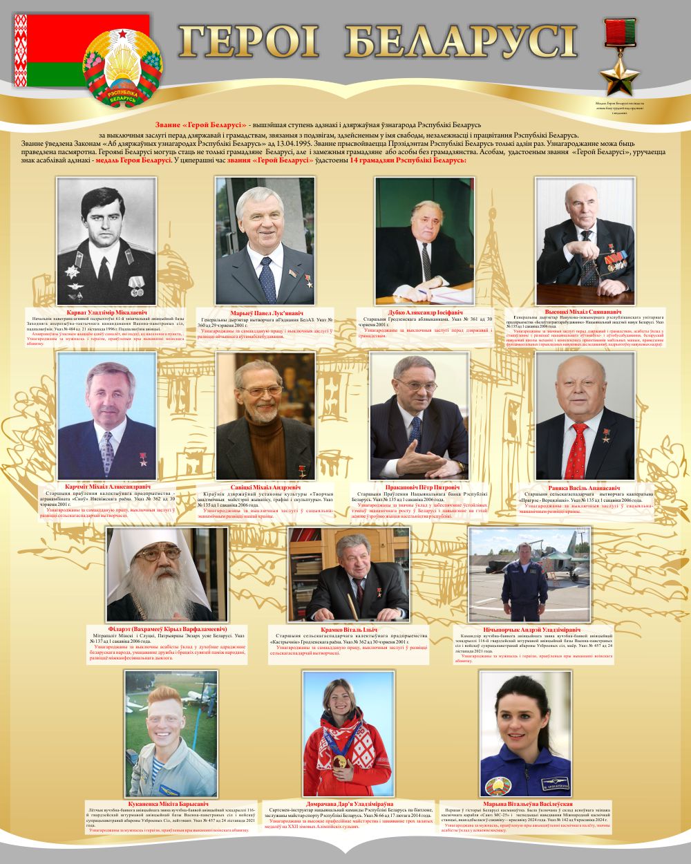 Стенд Героі Беларусі в золотисто-серебристых тонах на бел мове