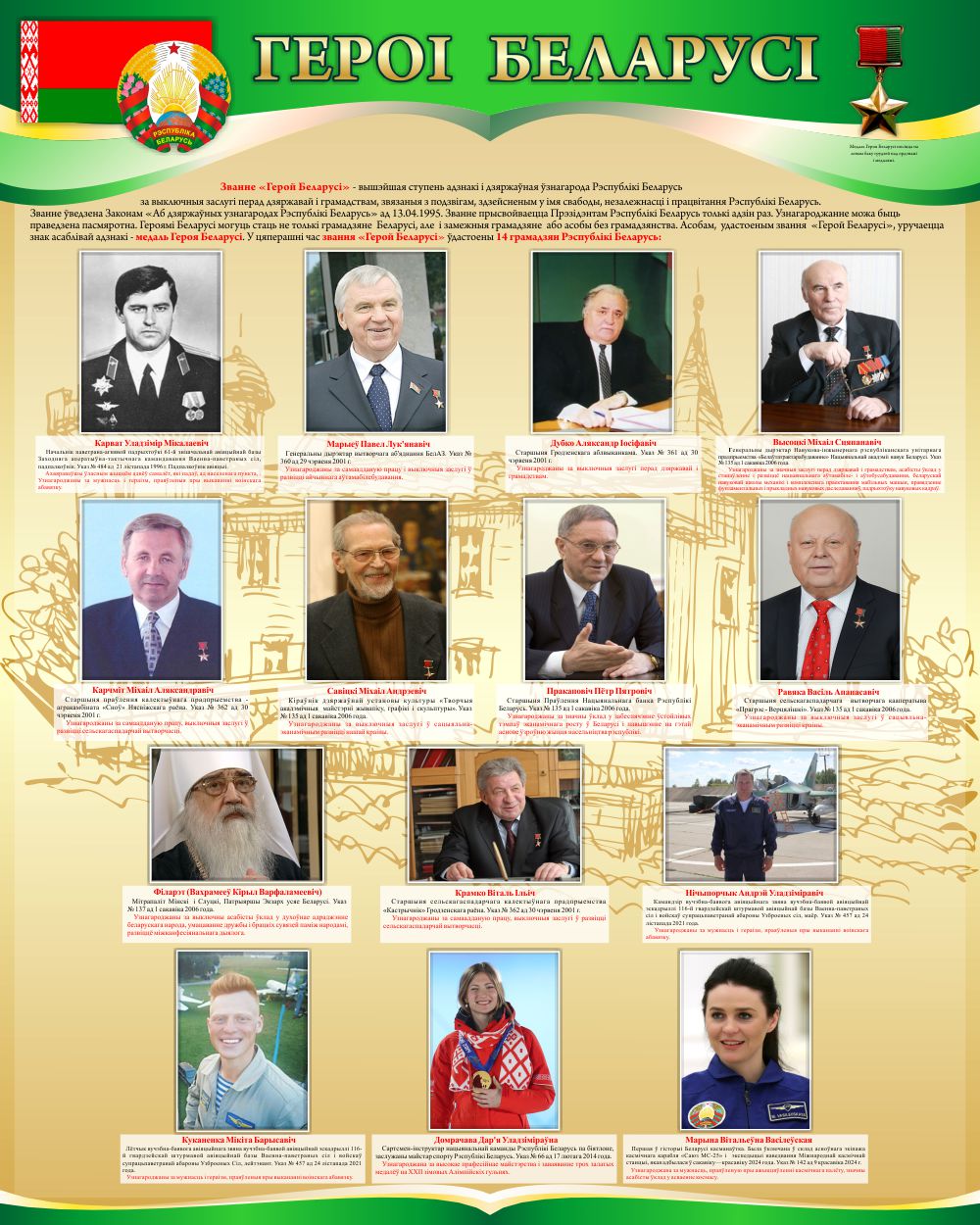 Стенд Героі Беларусі в золотисто-зеленых тонах на бел мове
