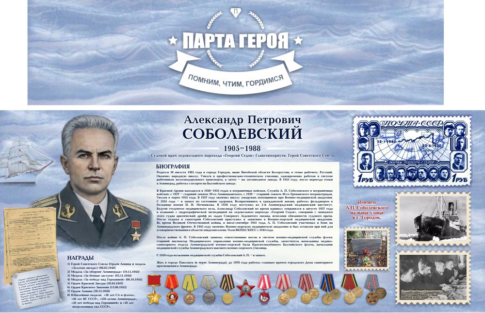 Гарантия качества Стенд Парта героя. Выполнен в бледно-голубых тонах.