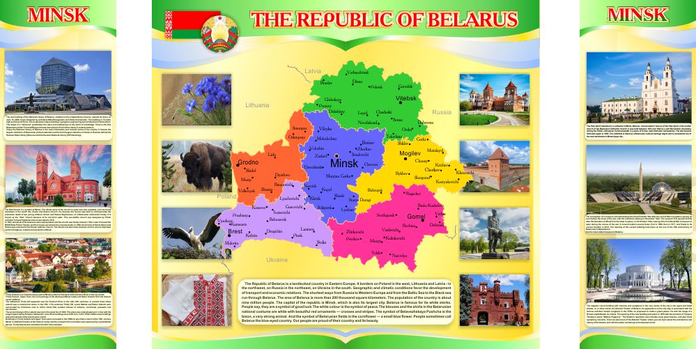 Гарантия качества                                                            Композиция стендов Карта Беларуси на английском языке для оформления кабинета английского языка с достопримечательностями Минска. Выполнен в зелено-желтых тонах.