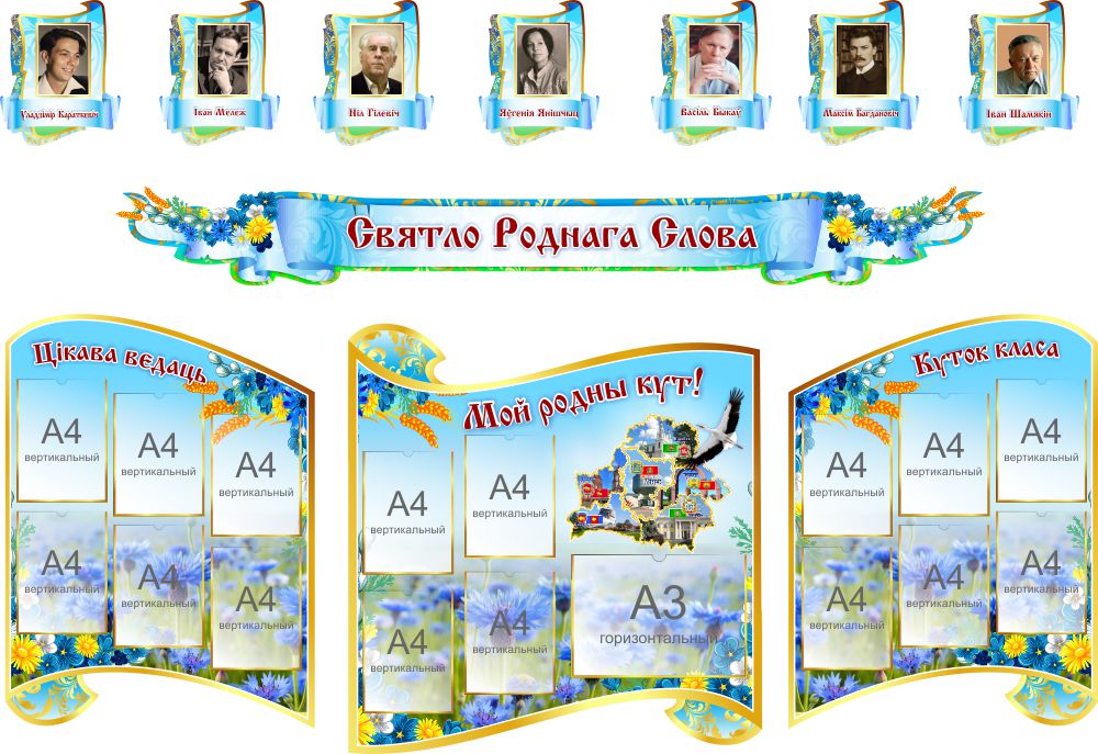 Гарантия качества Фигурный стенд-композиция для кабинета белорусского языка и литературы, выполнен в голубых тонах. Состоит из центральной композиции из 3 стендов, шапки и портретов.