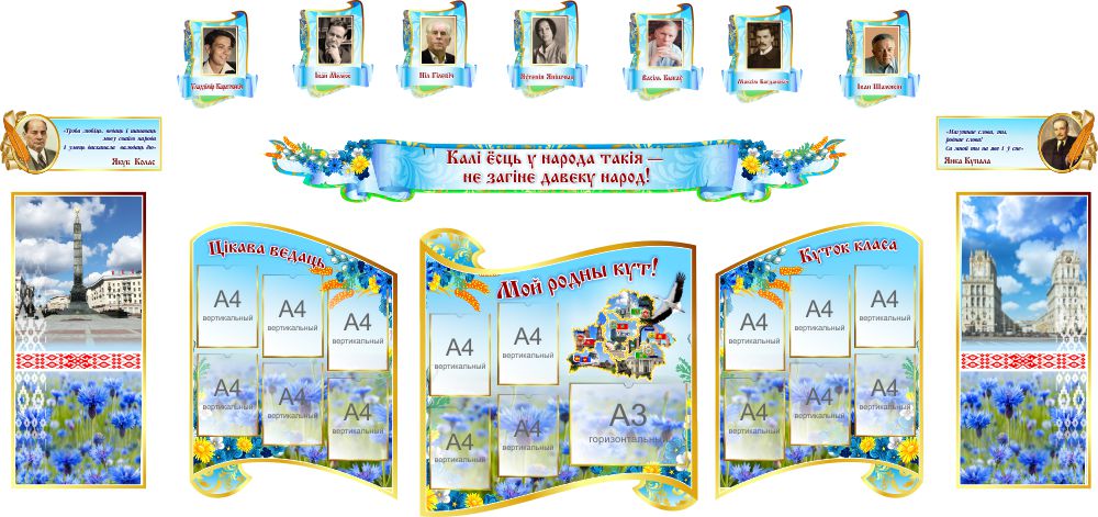 Гарантия качества Фигурный стенд-композиция для кабинета белорусского языка и литературы, выполнен в голубых тонах. Состоит из центральной композиции из 5 стендов, шапки, двух стендов с цитатами и портретов.