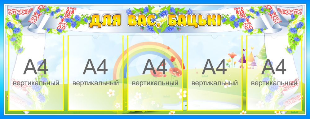 Родители часто задают вопросы про своих деток. Уделить время каждому родителю физически сложно и требует много времени. Данный стенд поможет Вам "передать" необходимую информацию о грядущих мероприятиях Вашей группы, достижениях, планах и.т.д. Дизайн стенда "Для вас, бацькi" выполнен в ярких жёлтых тонах с изображением цветочков. На стенде находятся карманы формата А4 для размещения необходимой информации для родителей: графики, нормы, грамоты, списки и др. Предназначен для оформления группы "Василёк" в едином стиле. Размер: 1250*480 мм