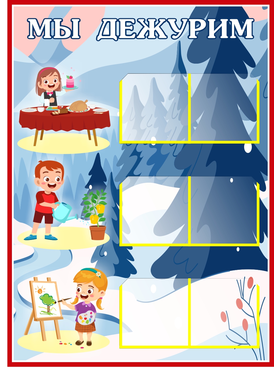 Карманы для размещения карточек с картинками (грибочки, солнышки, животные и т.д.), как на шкафчиках детей. По 2 карточки на каждое дежурство.