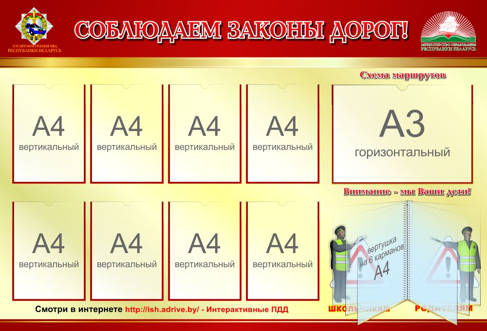 Гарантия качества Стенд Соблюдаем законы дорог! в золотисто-бордовых тонах 1500*1020 мм. Стенд выполнен в золотисто-бордовых тонах. На стенде изображены эмблемы ГОСАВТОИНСПЕКЦИЯ МВД РЕСПУБЛИКИ БЕЛАРУСЬ и МИНИСТЕРСТВО ОБРАЗОВАНИЯ РЕСПУБЛИКИ БЕЛАРУСЬ.