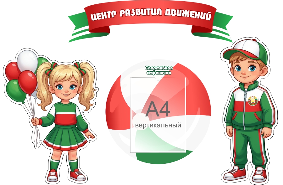 Модель 43403 Стенд-композиция Центр развития движений в зеленых, красных и белых тонах. Дети и спорт, спортивная жизнь, здоровье 1150*750мм