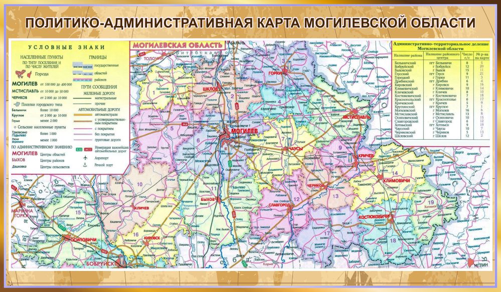 Стенд ПОЛИТИКО-АДМИНИСТРАТИВНАЯ КАРТА МОГИЛЕВСКОЙ ОБЛАСТИ в золотистых тонах