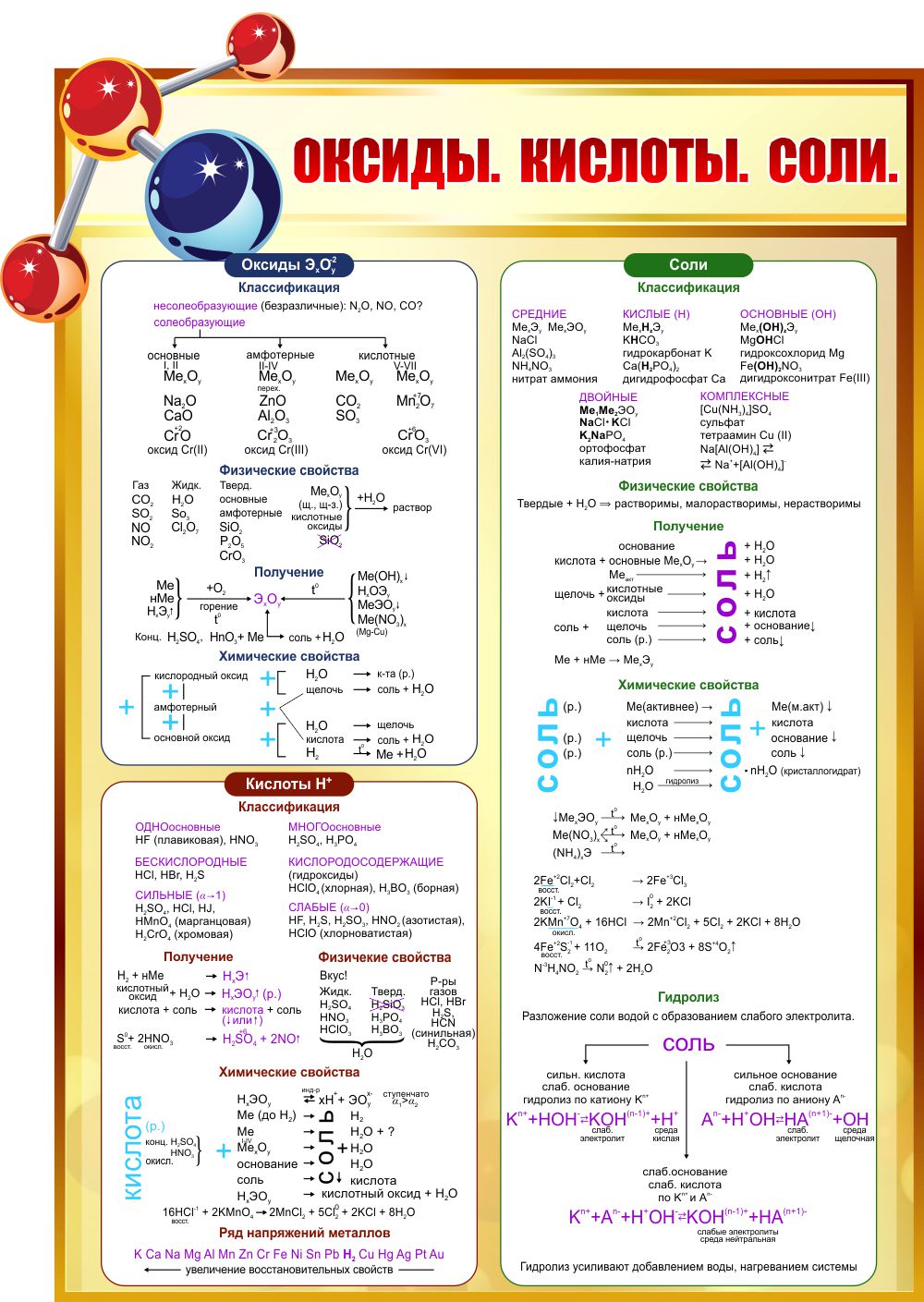Стенд Оксиды. Кислоты. Соли для кабинета химии в золотисто-коричневых тонах. Стенд выполнен в золотисто-коричневых тонах и входит в группу стендов, выполненных в одном стиле для оформления кабинета химии.