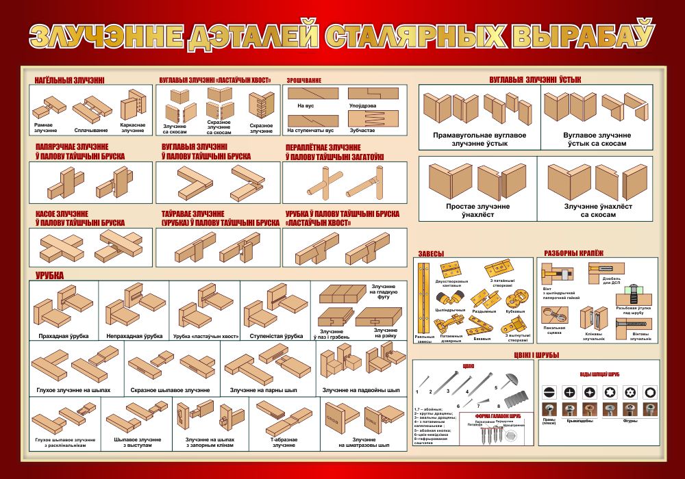 Модель 25628 Стенд Злучэнне дэталей сталярных вырабаў в кабинет трудового обучения на белорусском языке в бордовых тонах 1000*700мм