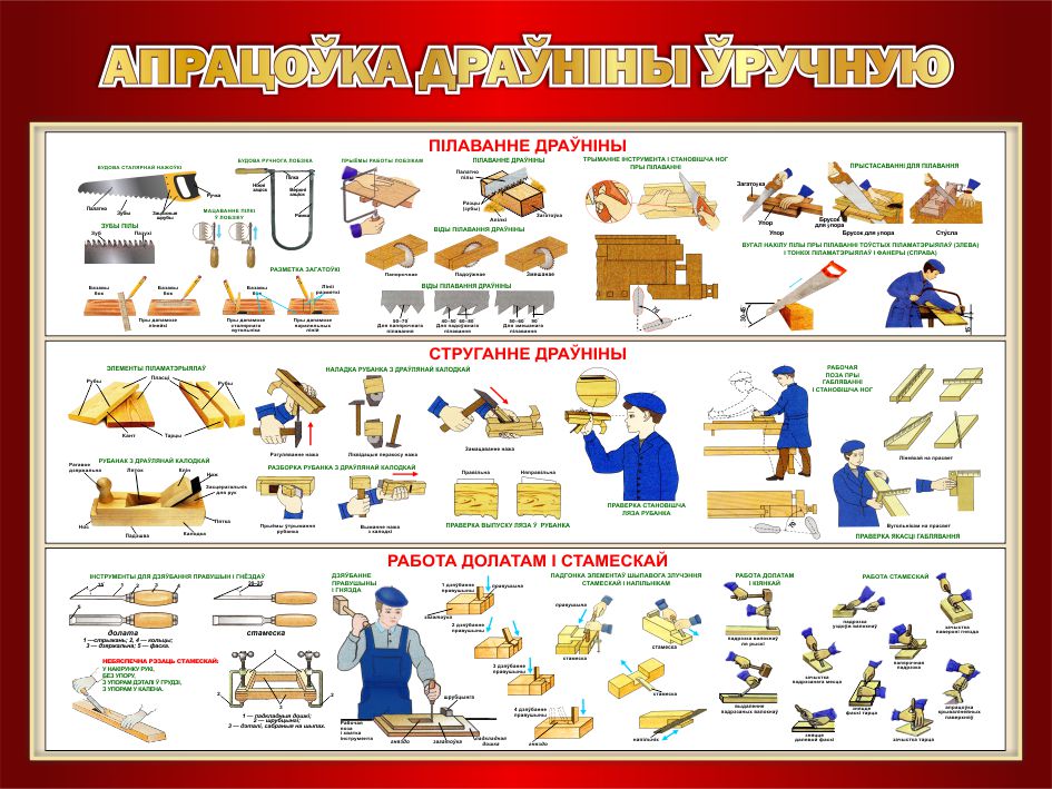 Модель 25630 Стенд Апрацоўка драўніны ўручную в кабинет трудового обучения на белорусском языке в бордовых тонах 1000*700мм