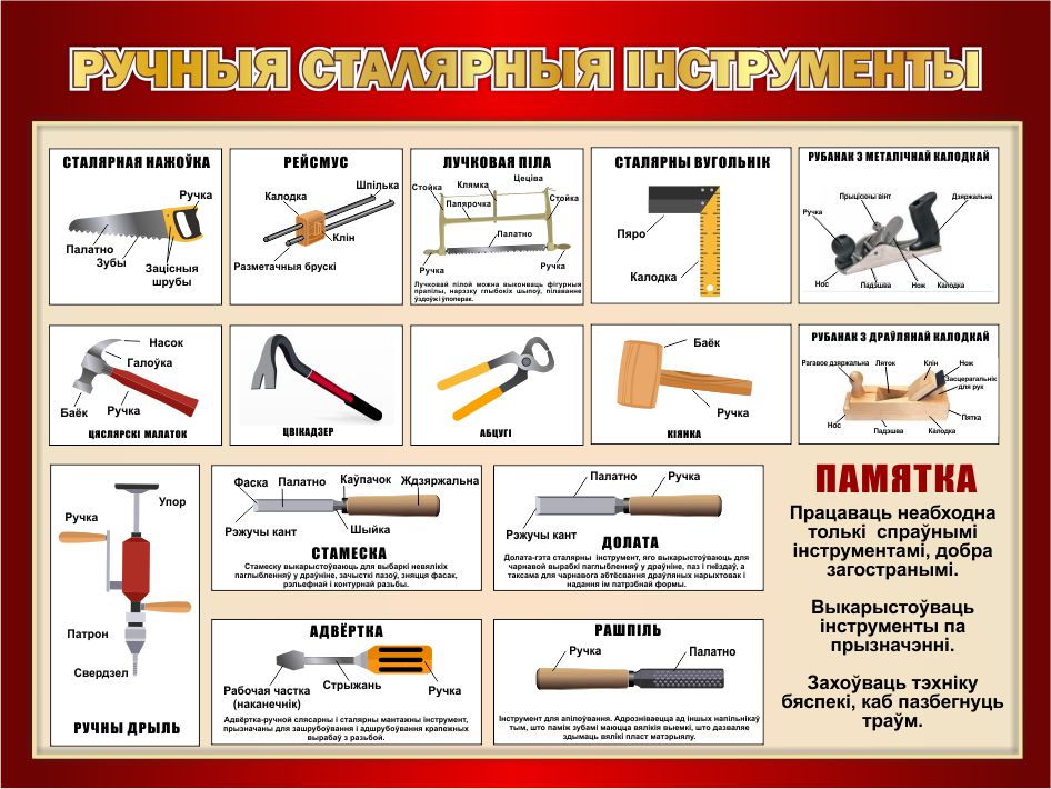 Модель 25632 Стенд Ручныя сталярныя інструменты в кабинет трудового обучения на белорусском языке в бордовых тонах 1000*700мм