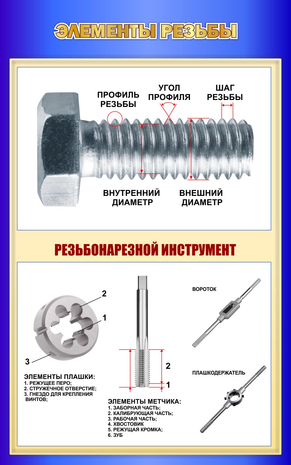 Стенд Элементы резьбы в синих тонах в кабинет трудового обучения. На стенде размещена информация об инструментах и основные правила работы с ними.