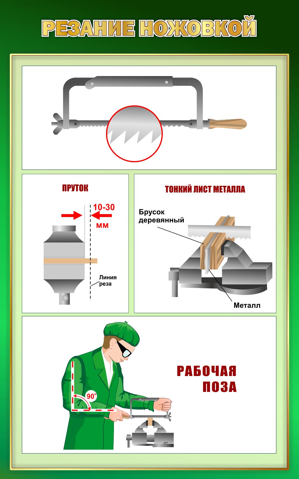 Стенд Резание ножовкой в столярных изделиях в зеленых тонах 500*800 мм