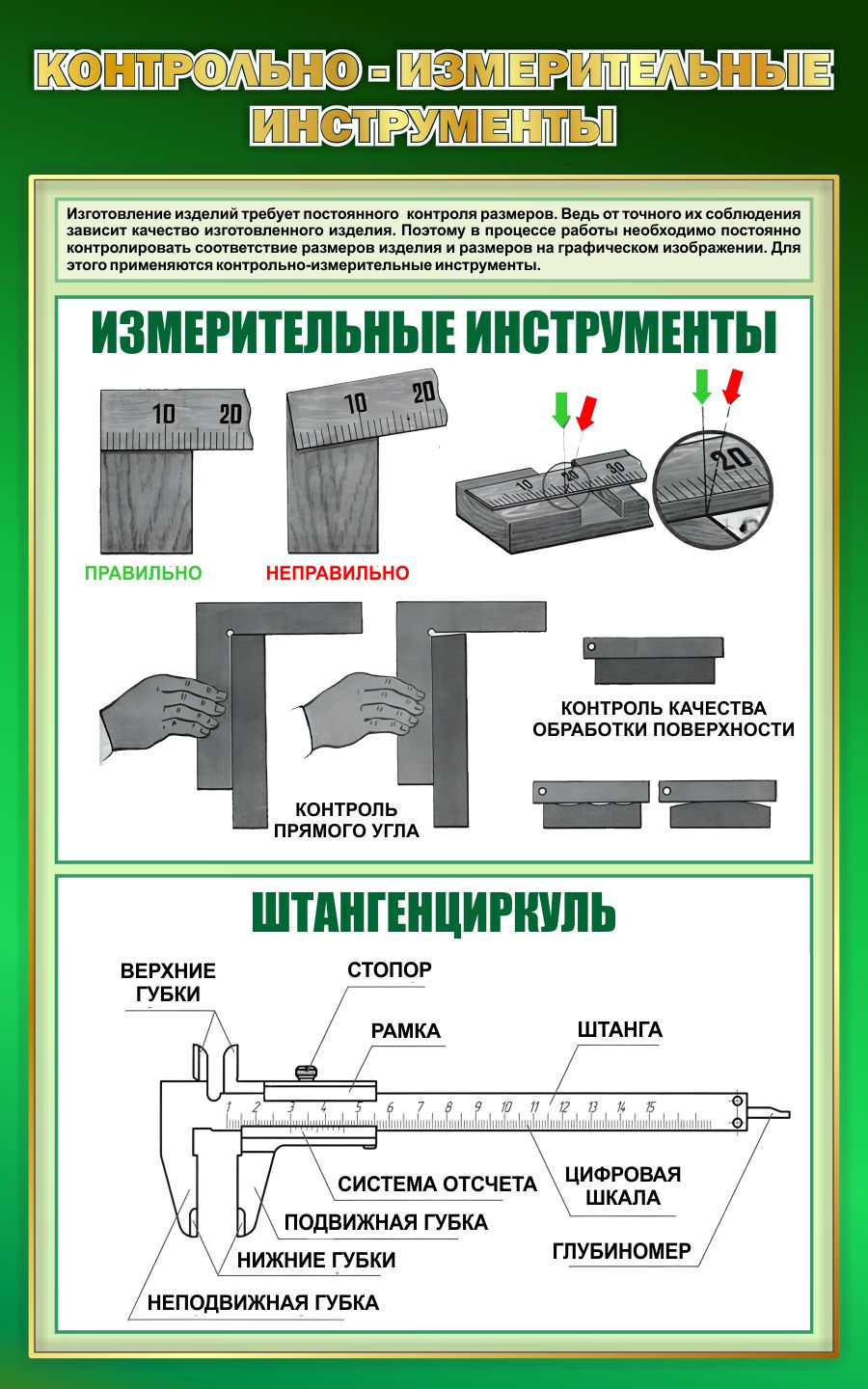 Стенд Контрольно-измерительные инструменты в зеленых тонах.