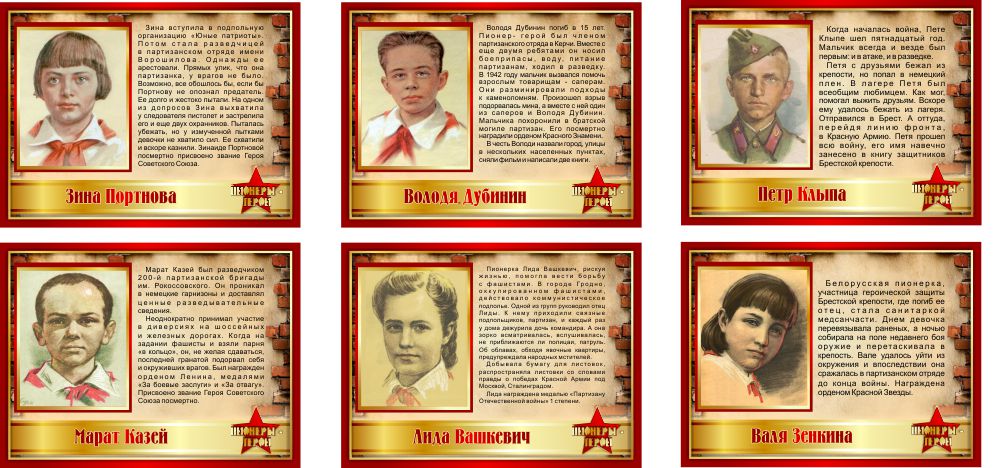 Гарантия качества Стенд композиция Пионеры-герои. Состоит из 6-ми частей. На каждой части информация о пионерах-героях: Зина Портнова, Володя Дубинин, Петр Клыпа, Лида Вашкевич, Марат Казей, Валя Зенкина