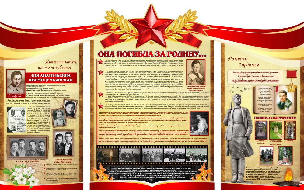 Гарантия качества Стенд композиция Стендовая композиция Она погибла за Родину посвящена Зое Космодемьянской. Состоит из 3-х частей и шапки. На каждой части информация о Зое Космодемьянской.