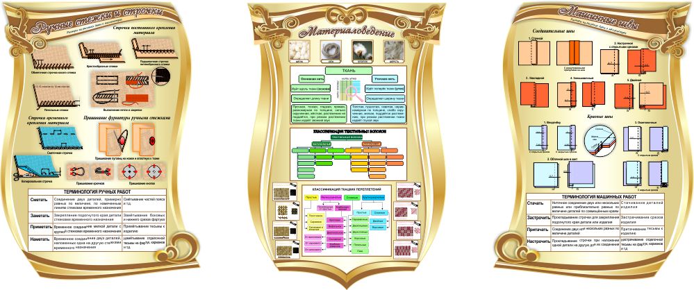 Композиция для кабинета обслуживающего труда в золотистых тонах. Состоит из частей: ручные стежки и строчки, материаловедение, машинные швы.