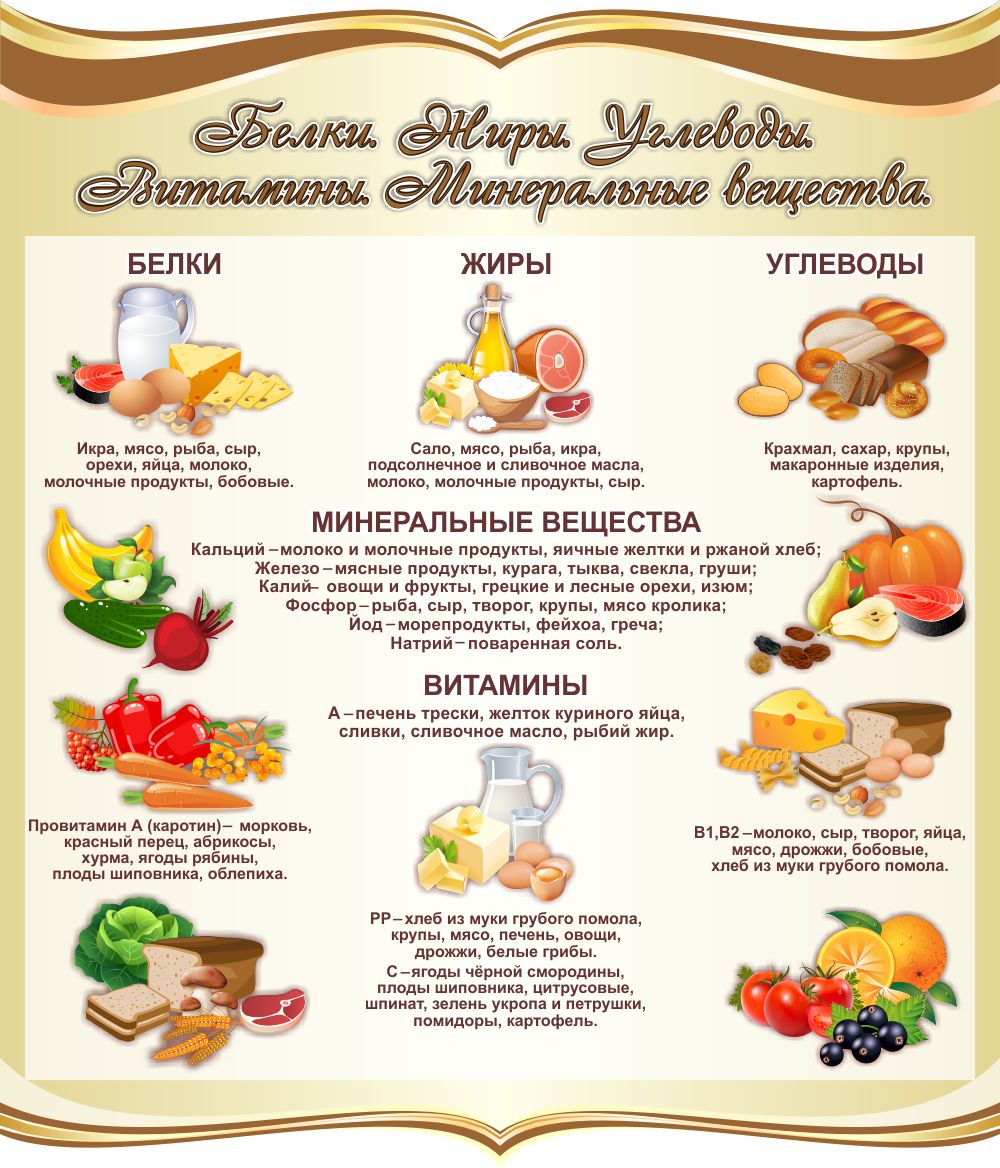 Стенд Белки Жиры Углеводы Витамины и Минеральные вещества в золотистых тонах