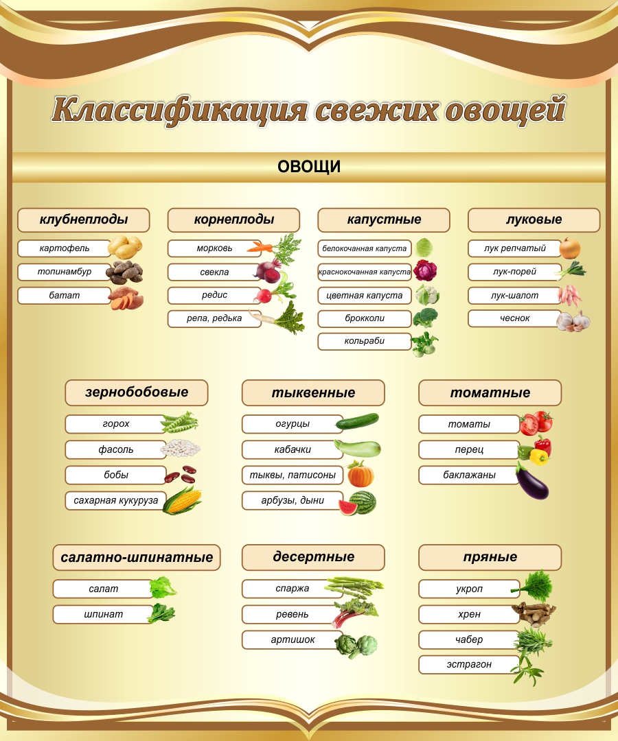Модель 25719 Стенд Классификация свежих овощей в золотистых тонах 1000*1200 мм