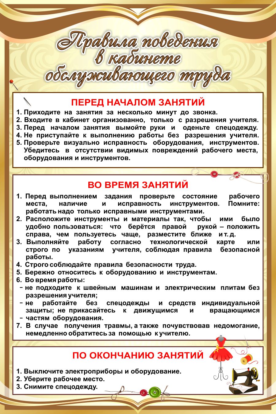 Стенд Правила поведения в кабинете обслуживающего труда в золотистых тонах