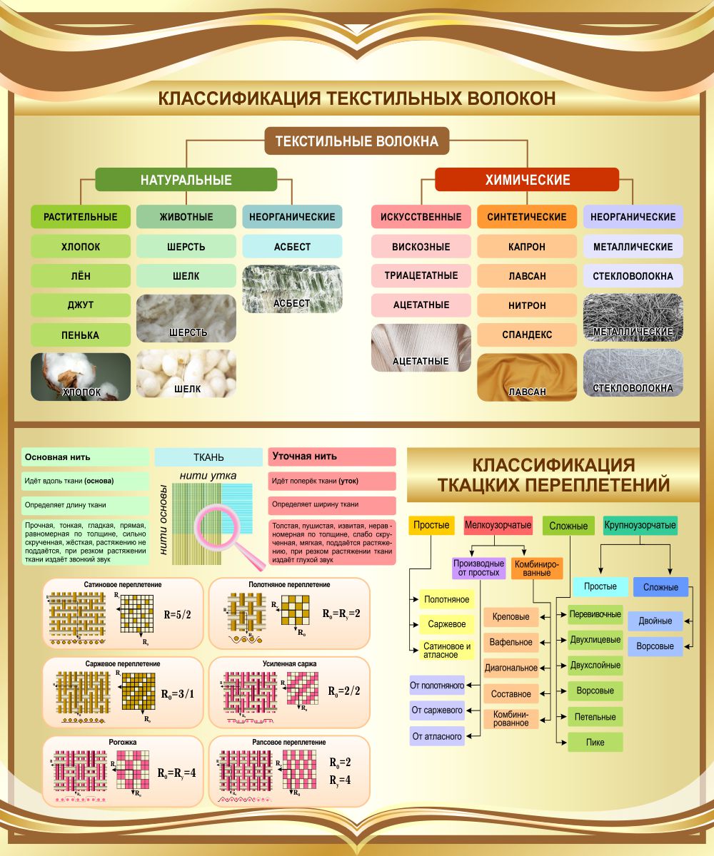 Модель 25710 Стенд Классификация текстильных волокон в золотистых тонах 1000*1200 мм