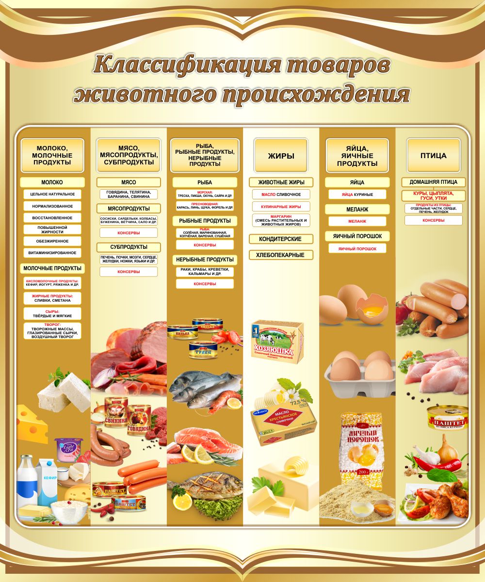 Модель 25712 Стенд Классификация товаров животного происхождения в золотистых тонах 1000*1200 мм